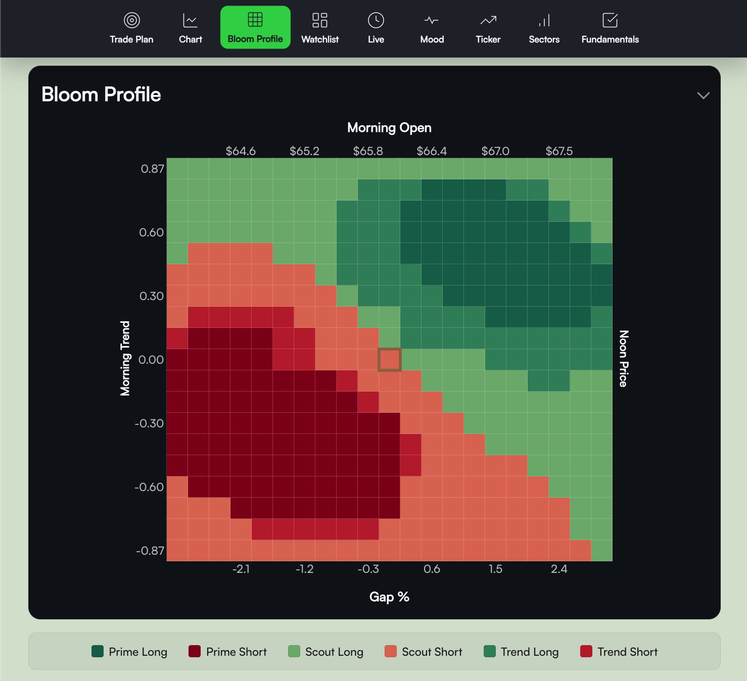 - Conditional model: The Bloom Profile predicts outcomes across a grid of (gap, morning-trend). You select the cell that matches today.