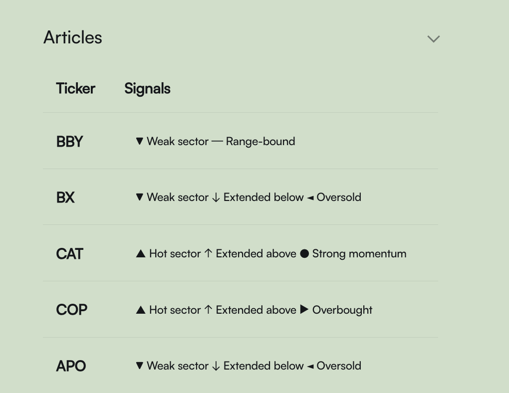 Each ticker page is a decision aid. It’s not just “here’s a stock.” It’s structured to answer: